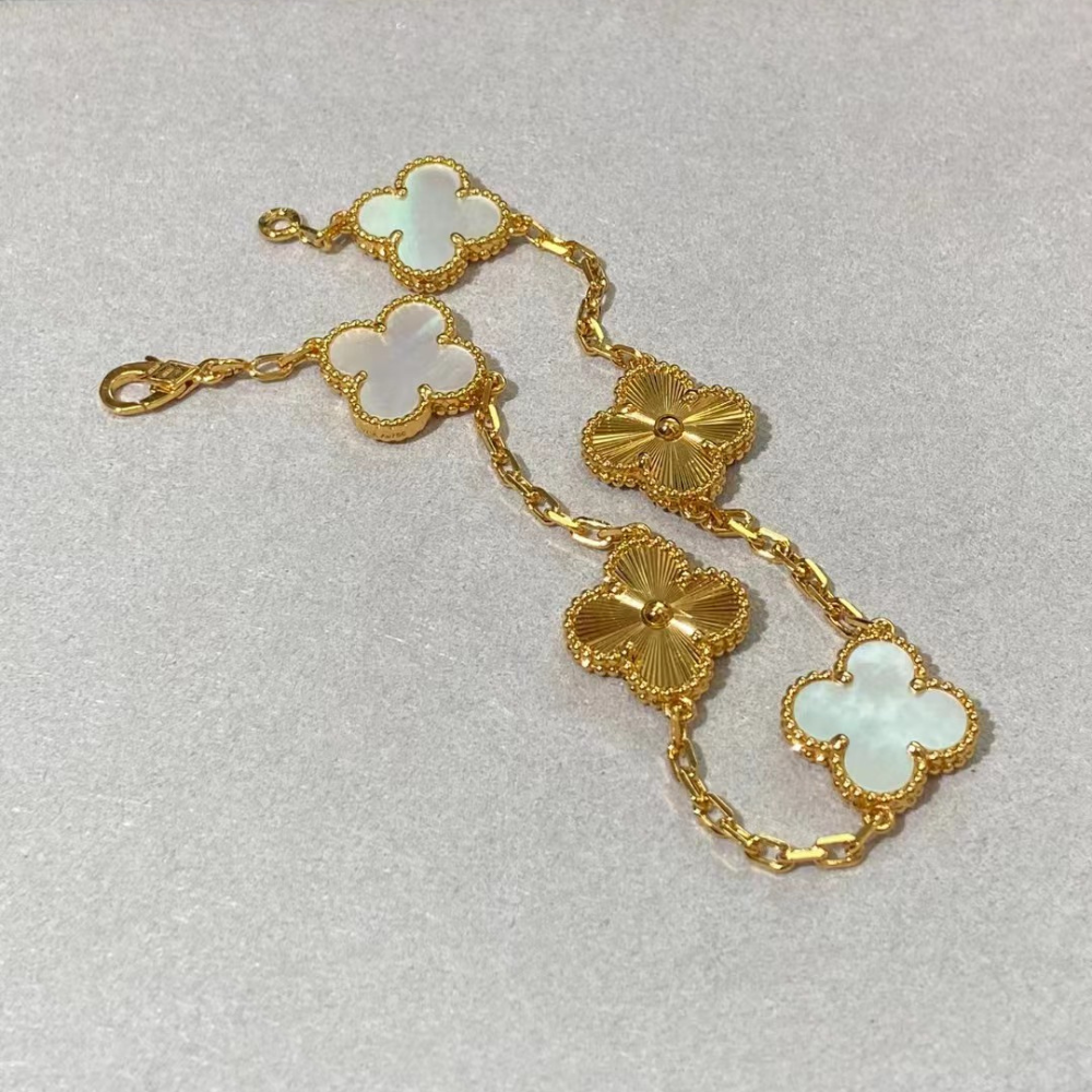The bracelet features refined four-leaf clover motifs arranged along a delicate chain, creating a graceful and feminine look. With a total length of approximately 7.48 inches, it fits comfortably on most wrists and is perfect for wearing alone or layering with other bracelets.