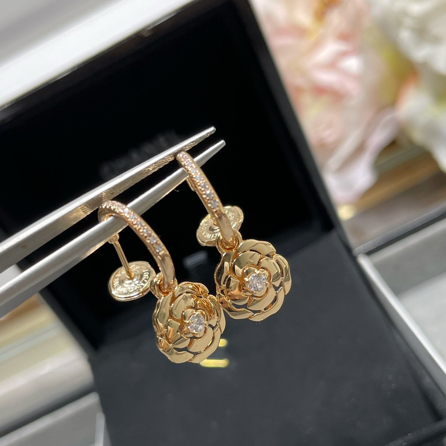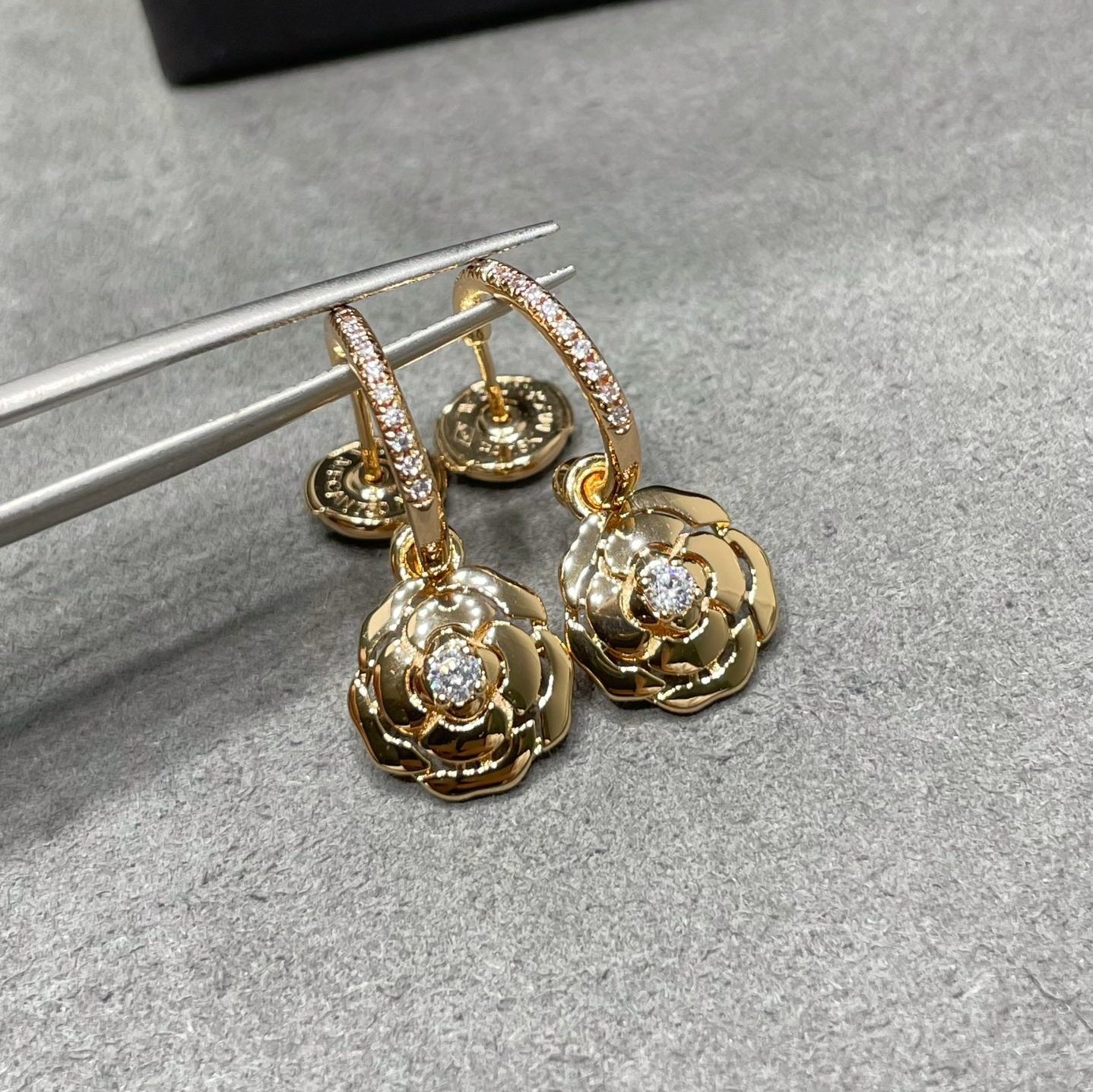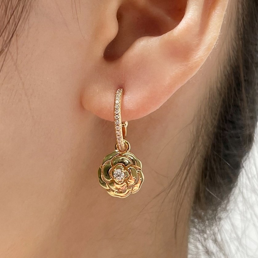 18K gold-plated floral motif drop earrings with cubic zirconia accents. Lightweight and elegant.
