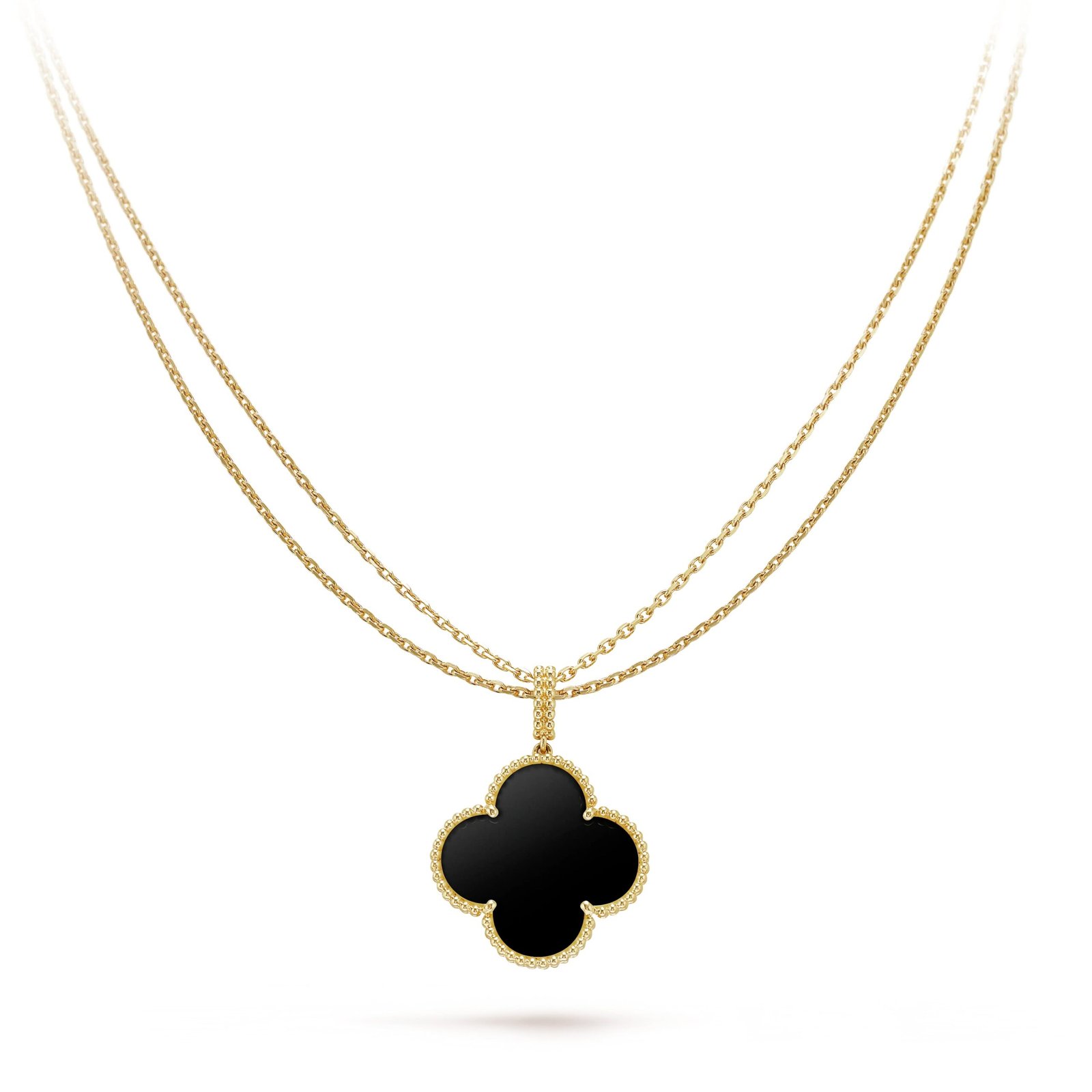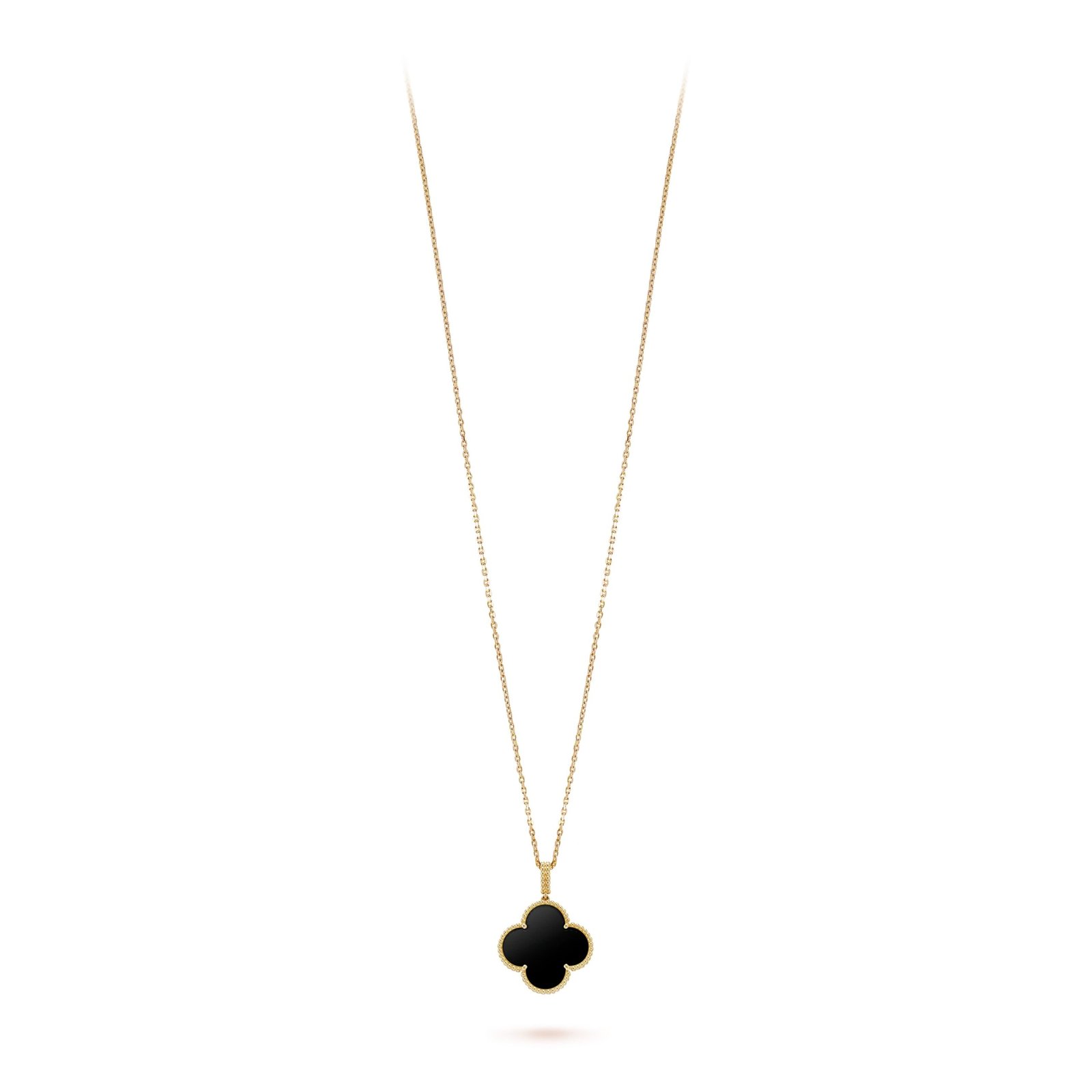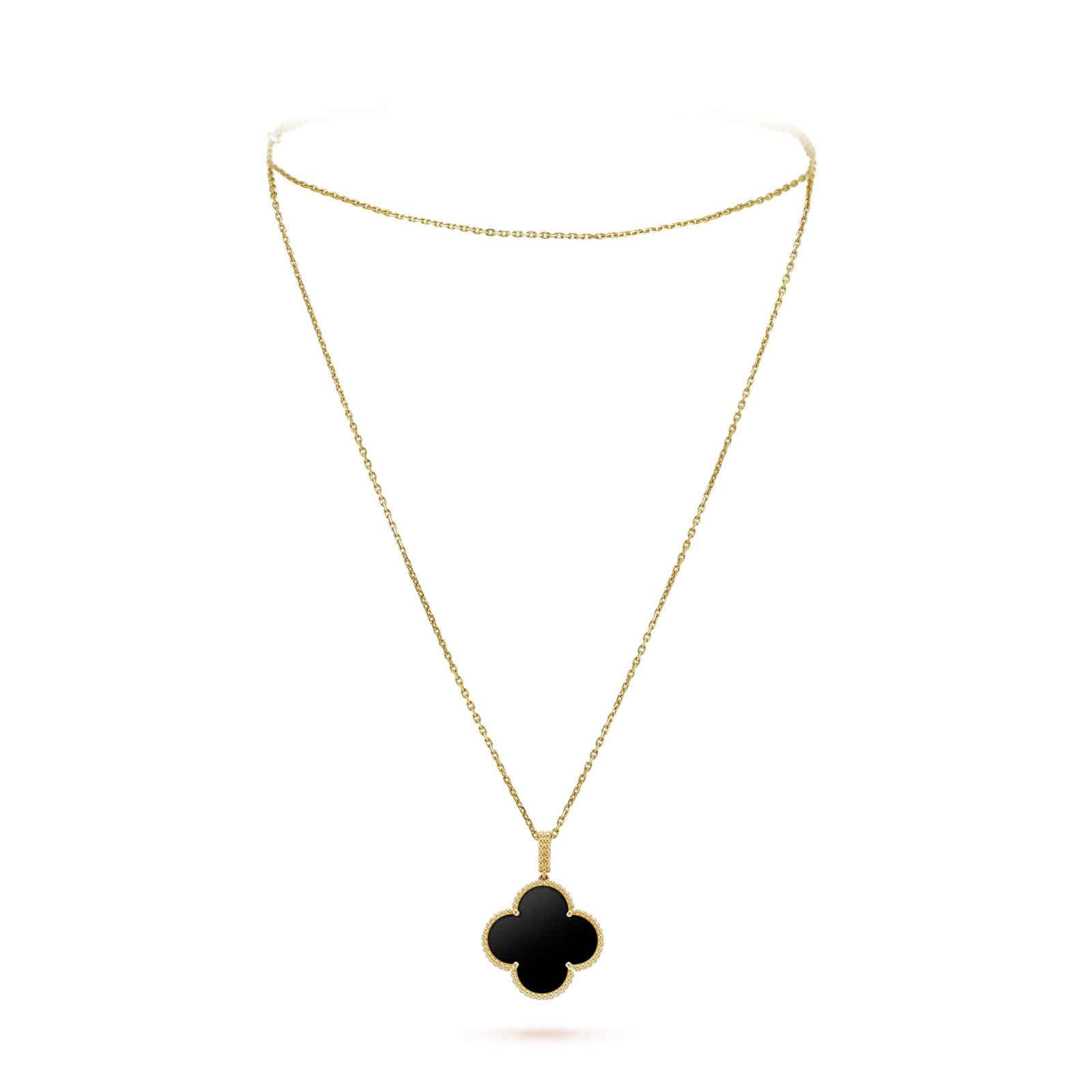 This elegant motif pendant long necklace features a refined symbolic design suspended from an elongated chain, creating a graceful and timeless silhouette.