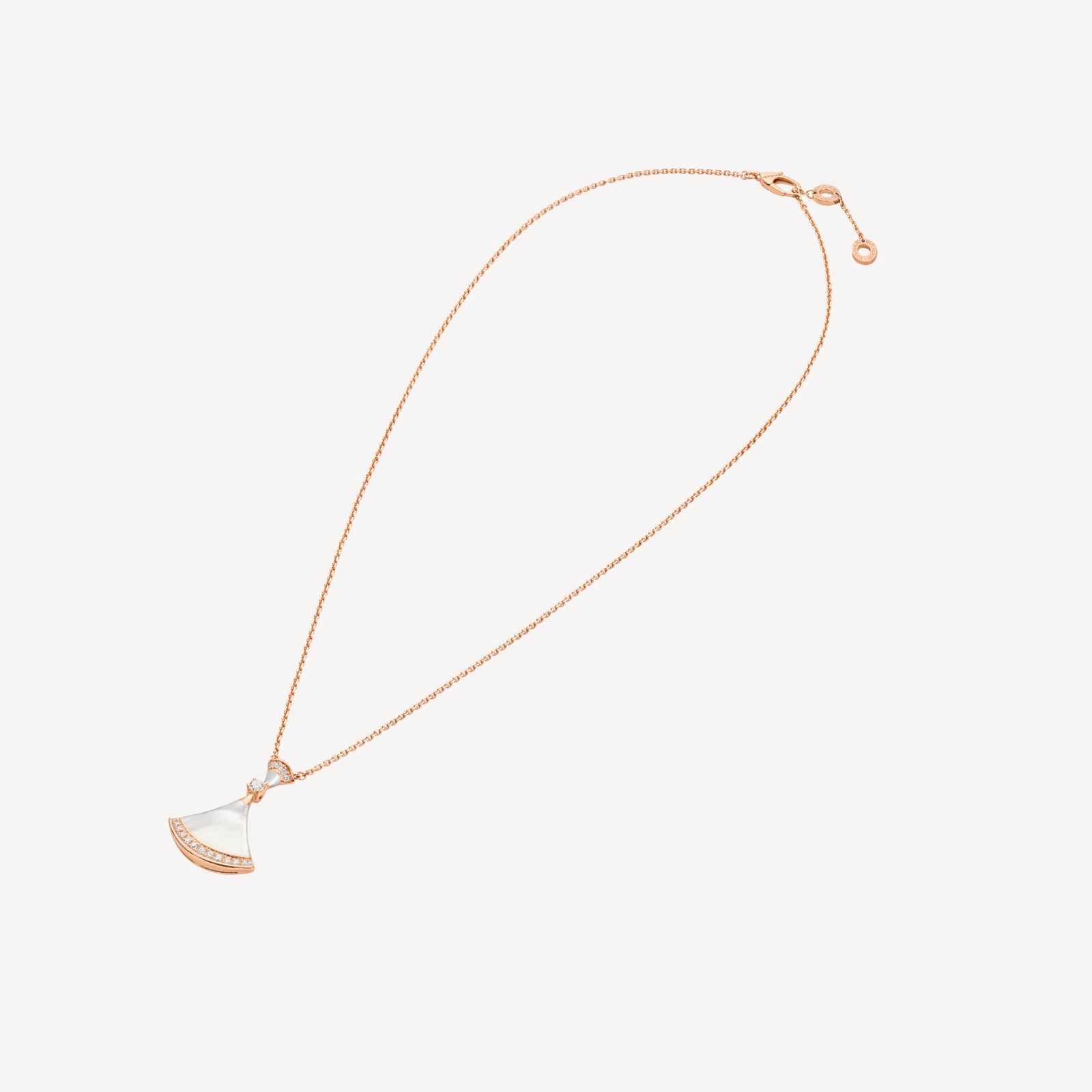 925 sterling silver necklace with 18K rose gold plating, featuring natural mother of pearl and cubic zirconia pavé in a fan-shaped pendant.