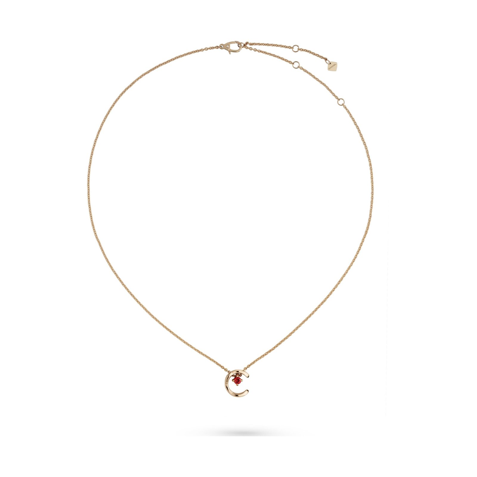 18K rose gold–plated letter pendant necklace with red cubic zirconia. Adjustable 15–16.14 inch chain.